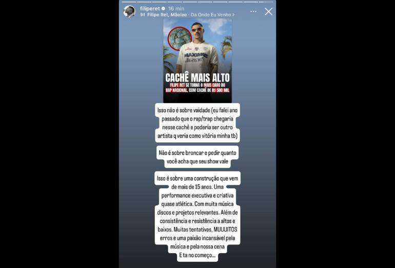 Nos stories do Instagram, o cantor e compositor celebrou a conquista, enfatizando que não é sobre vaidade. “Isso não é sobre vaidade (eu falei ano passado que o rap/trap chegaria nesse cachê e poderia ser outro artista que veria como vitória minha também). Não é sobre brincar e pedir quanto você acha que seu show vale”, escreveu.