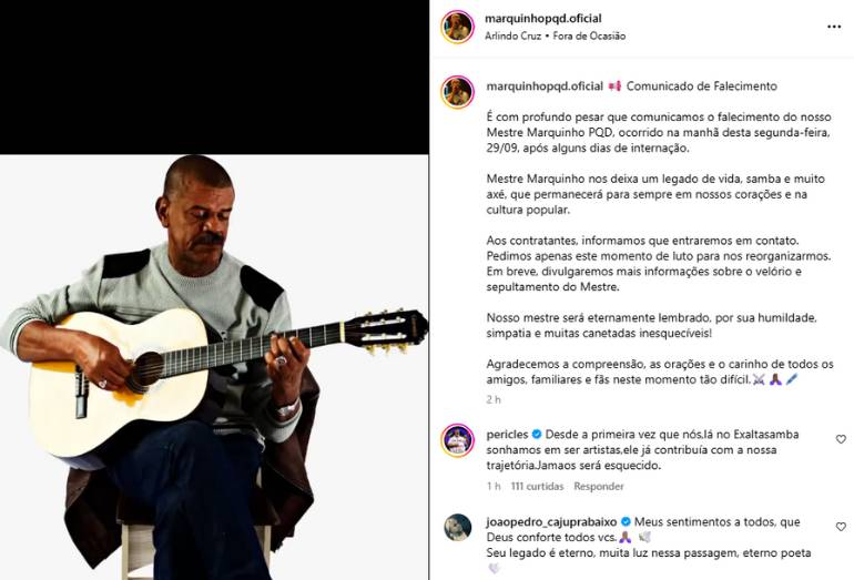 Nas redes sociais, a equipe do sambista anunciou seu falecimento e pediu compreensão de contratantes. Informações sobre a despedida serão divulgadas em breve.
