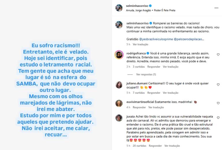 Porta-bandeira da Beija-Flor de Nilópolis, Selminha Sorriso usou as redes sociais nesta terça-feira (22) para revelar que, após passar a estudar letramento racial, concluiu que sofre racismo.